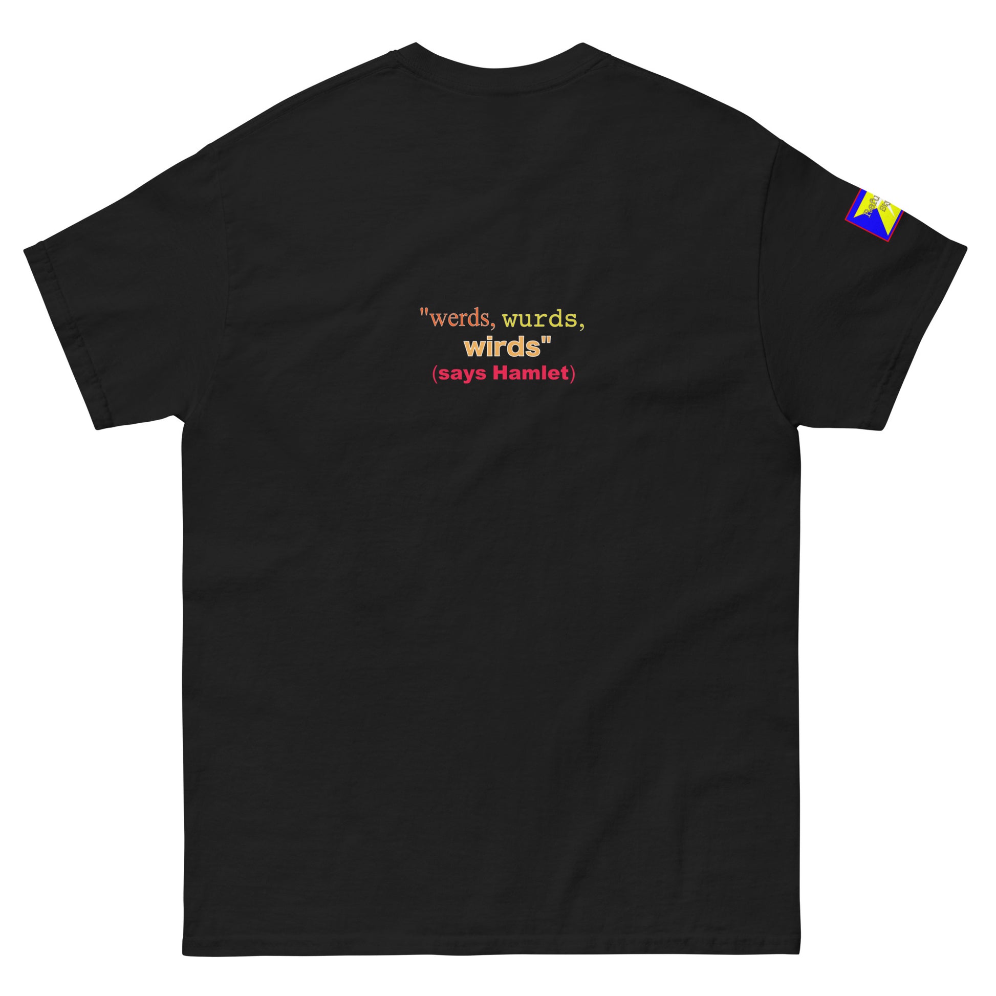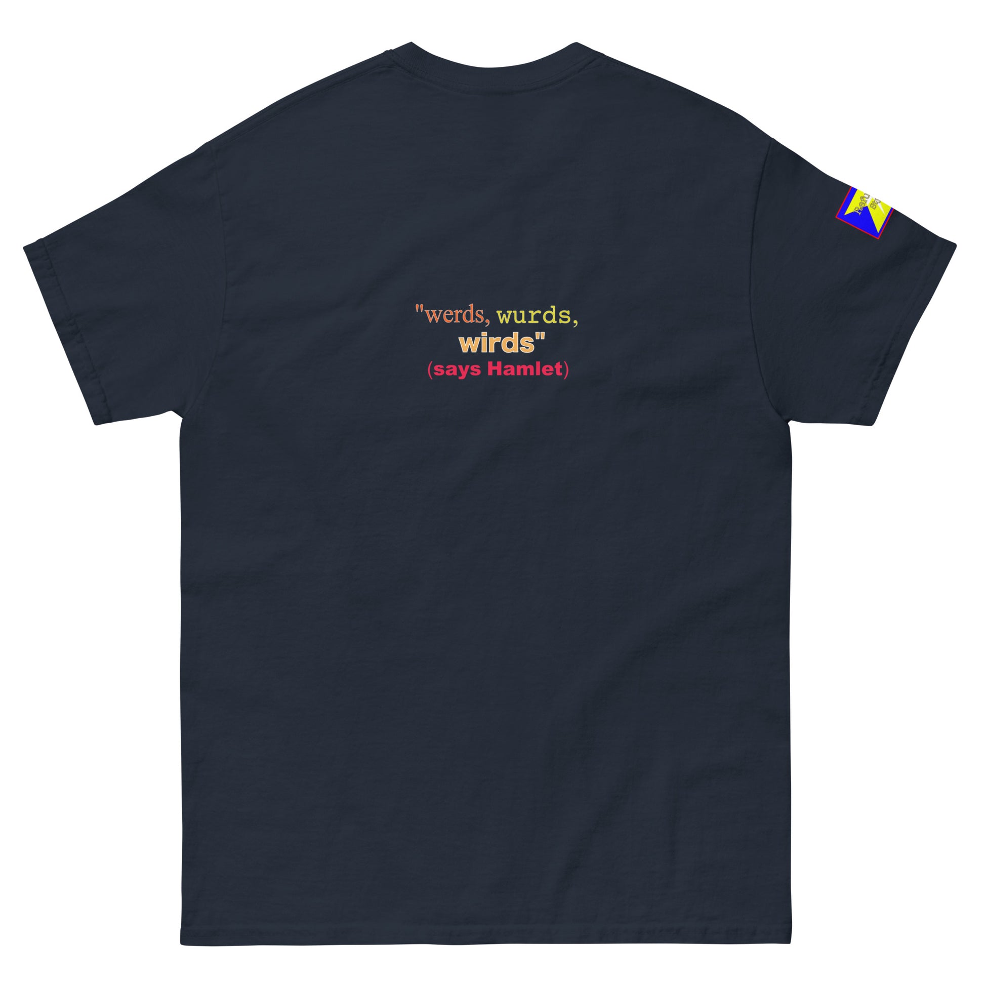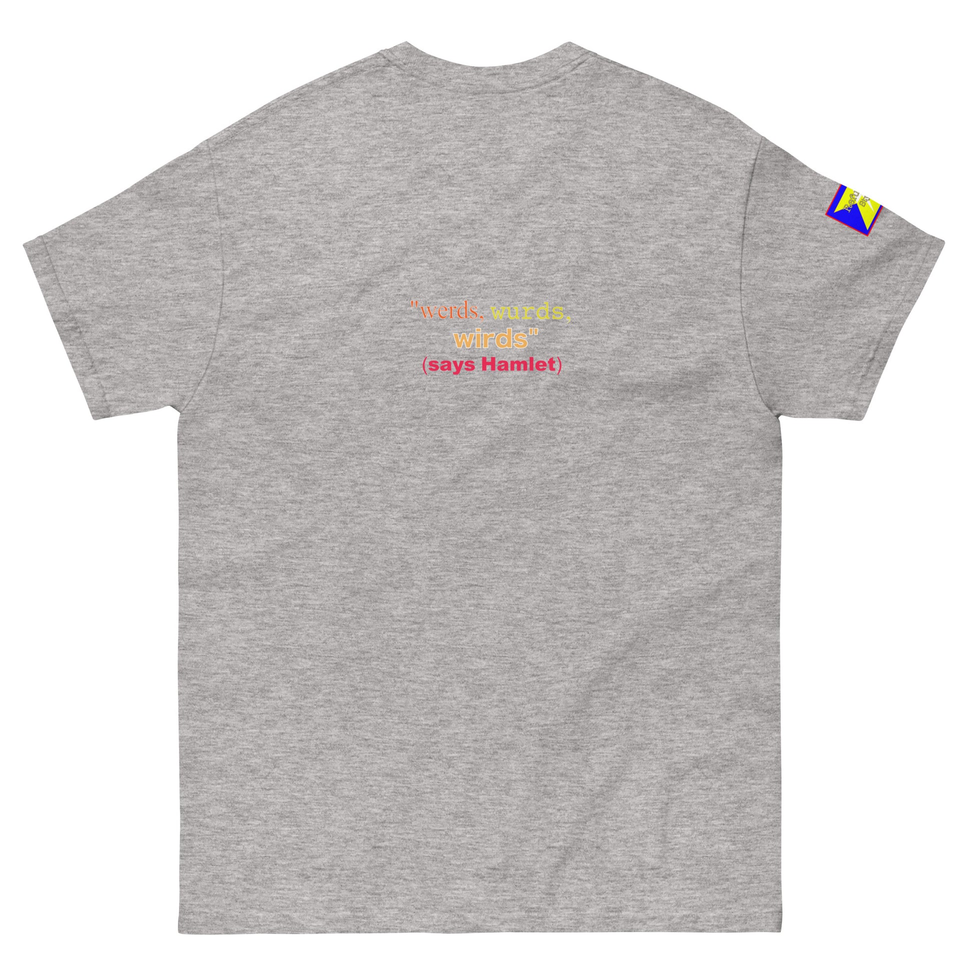 On a shirt about a master of words, an aide memoire - that words are only sounds we represent with shapes - seems a reasonable thing.