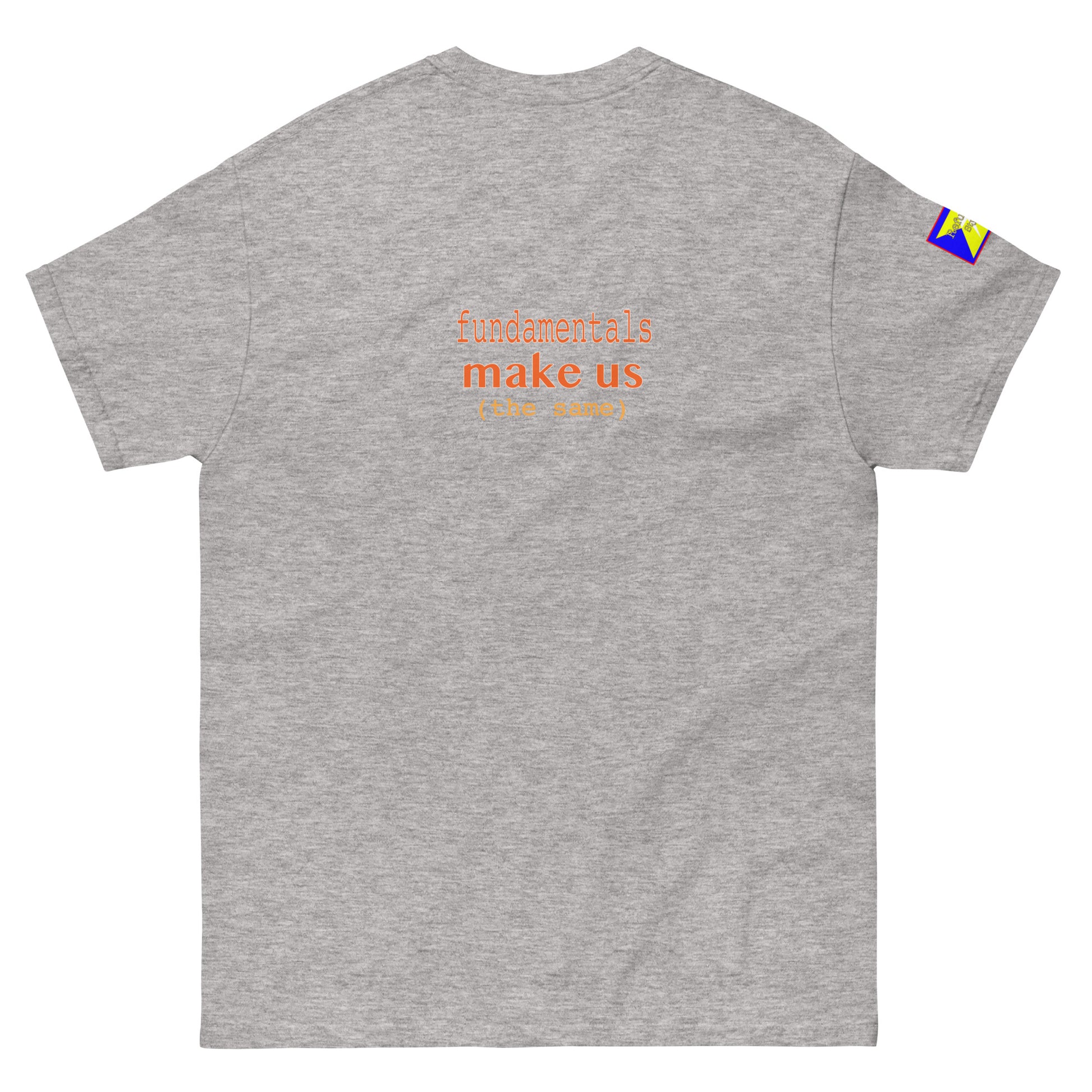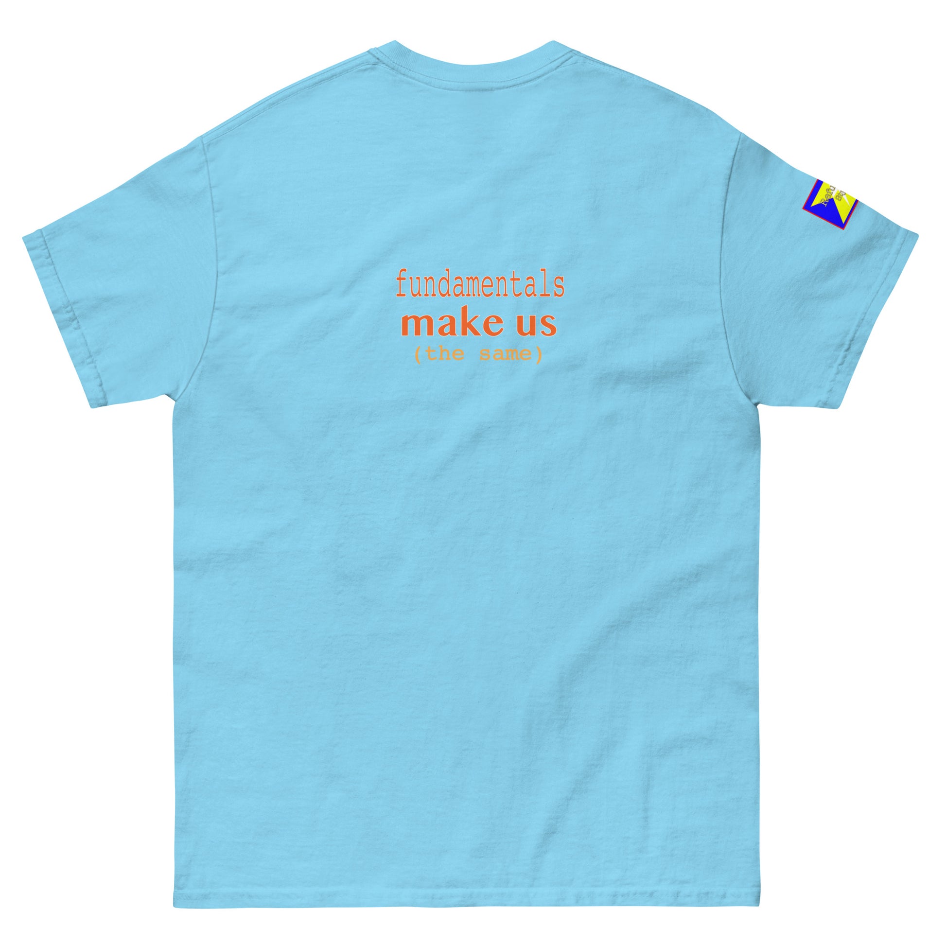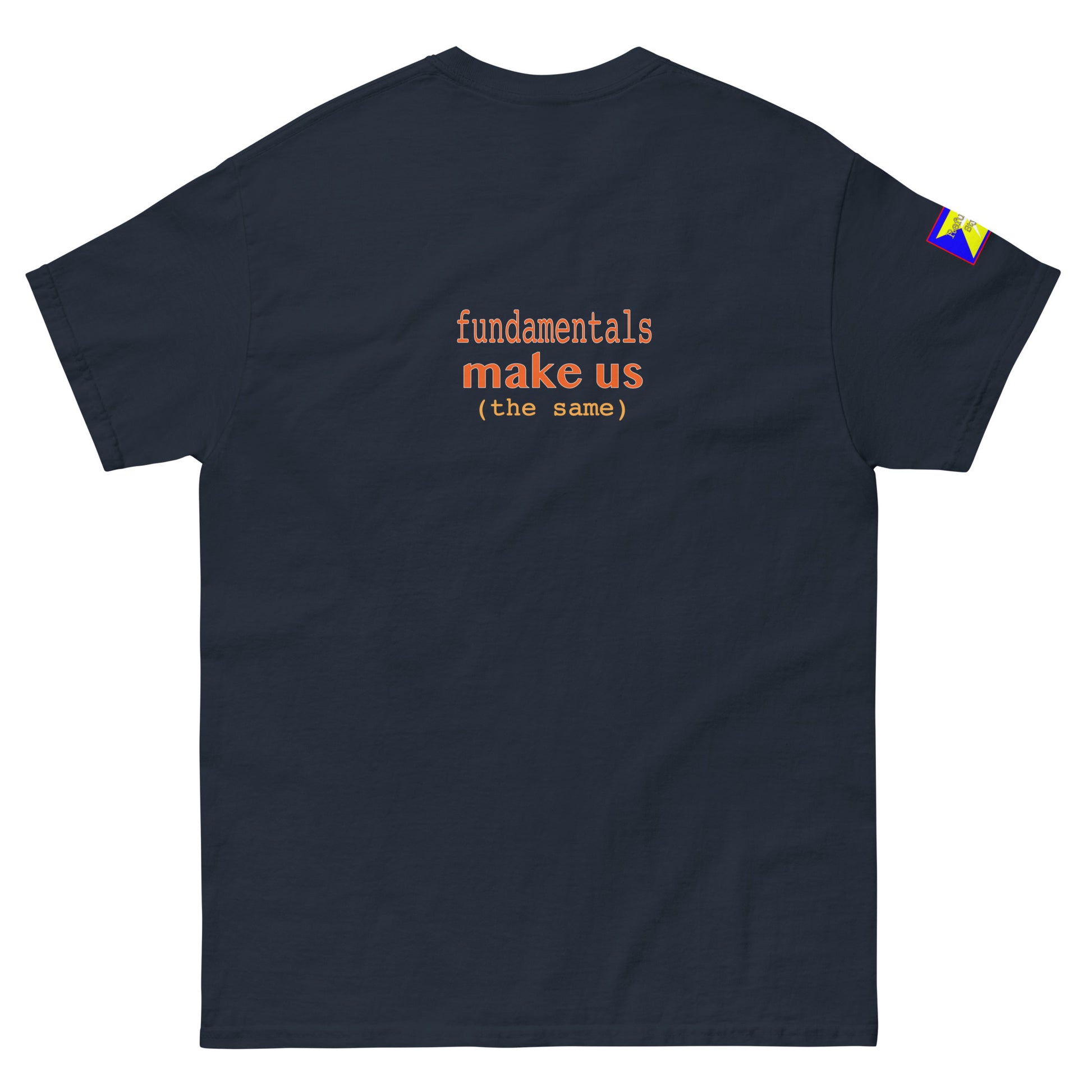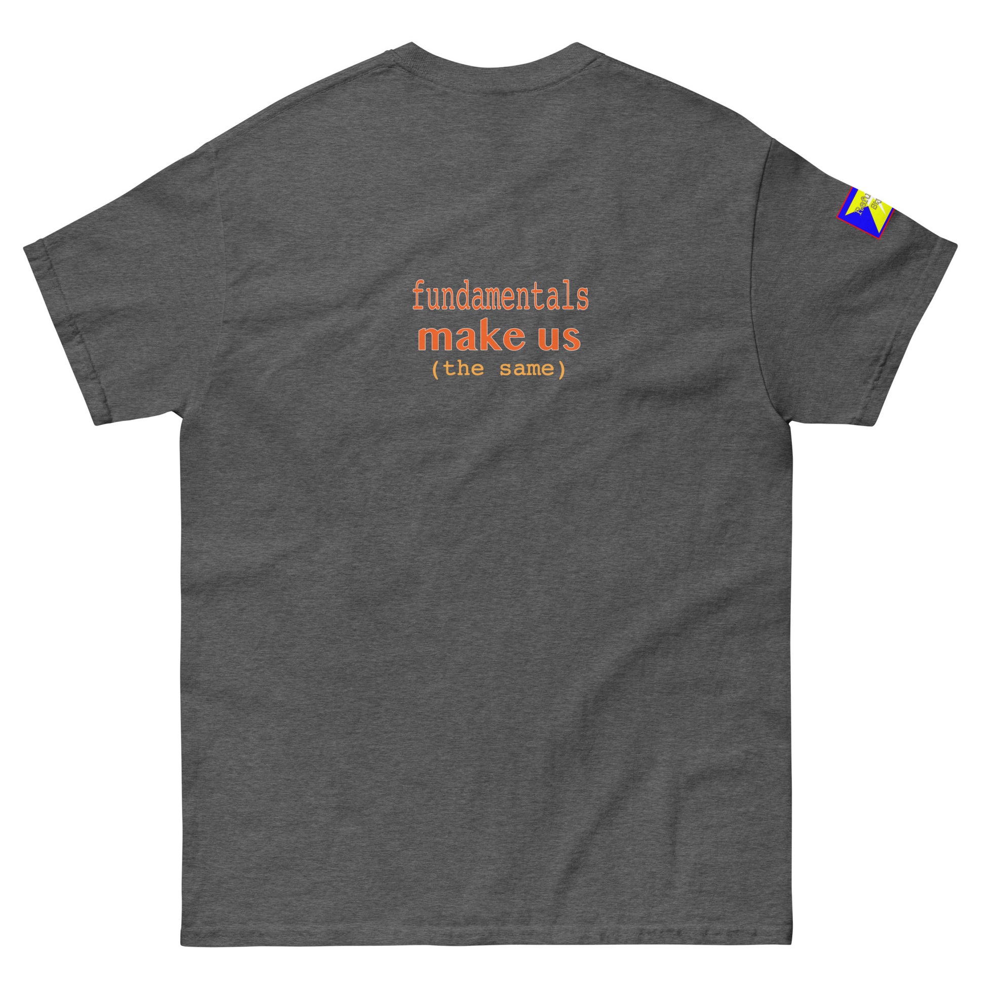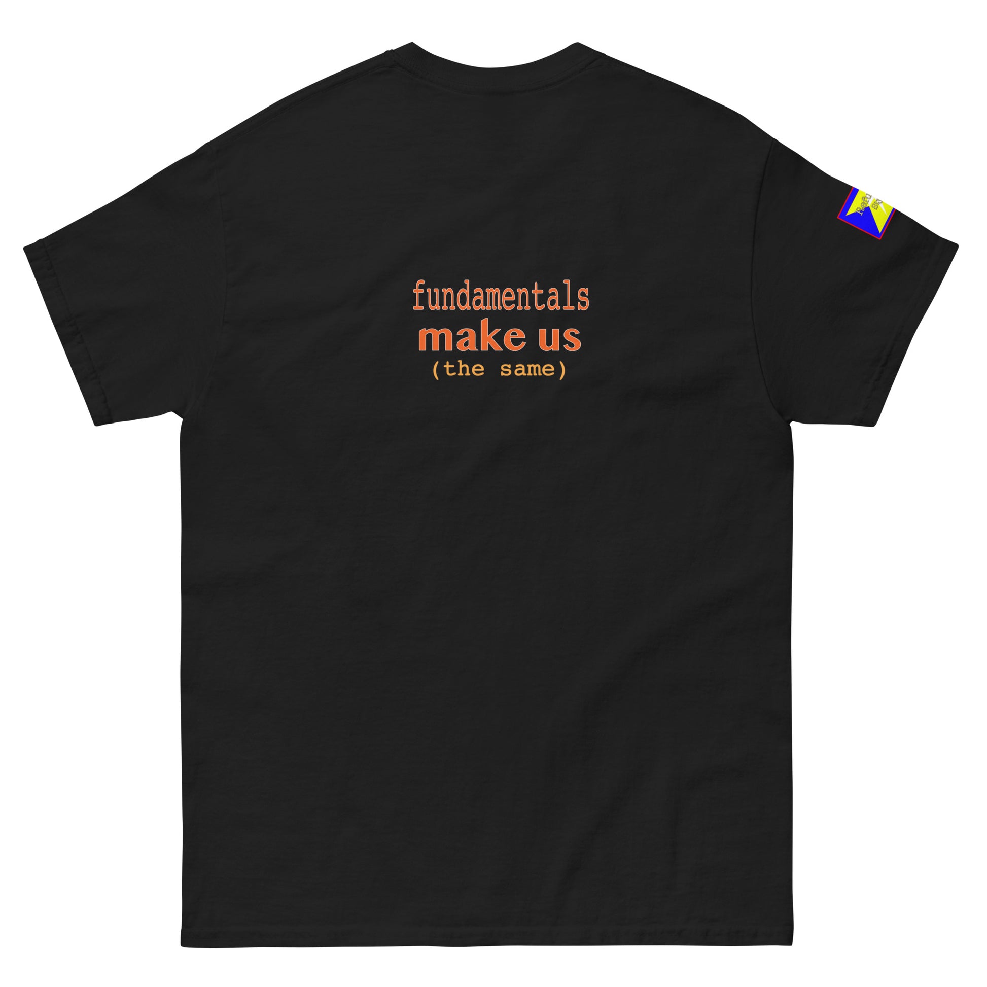 'fundamentals make us (the same)' is the message on the back of this shirt.